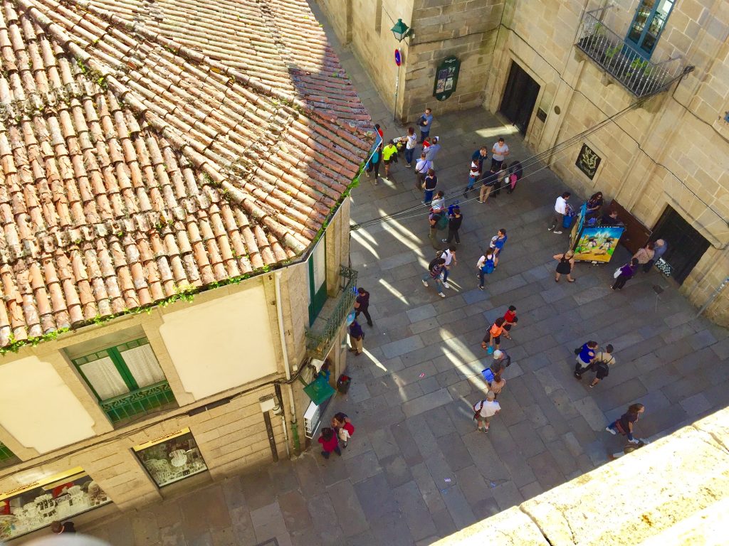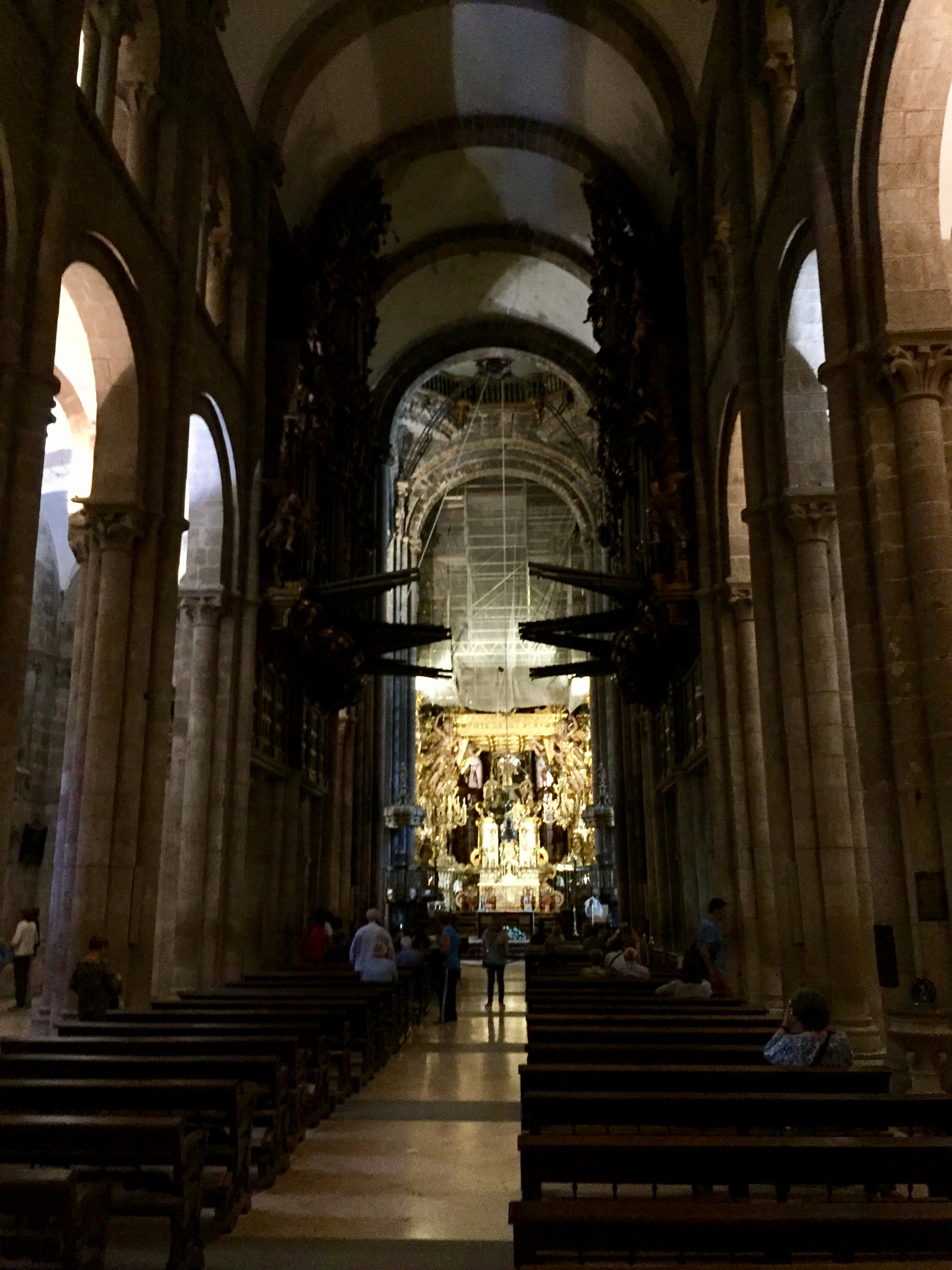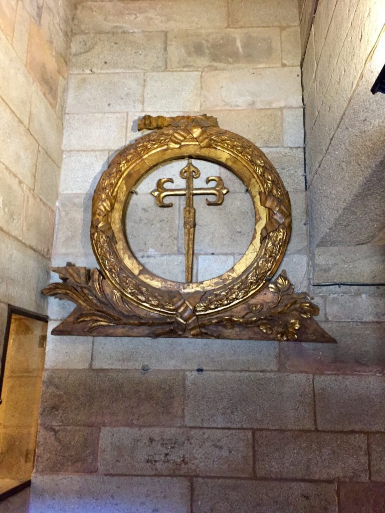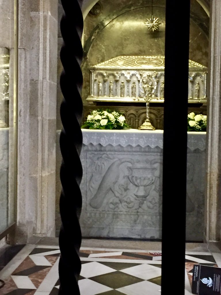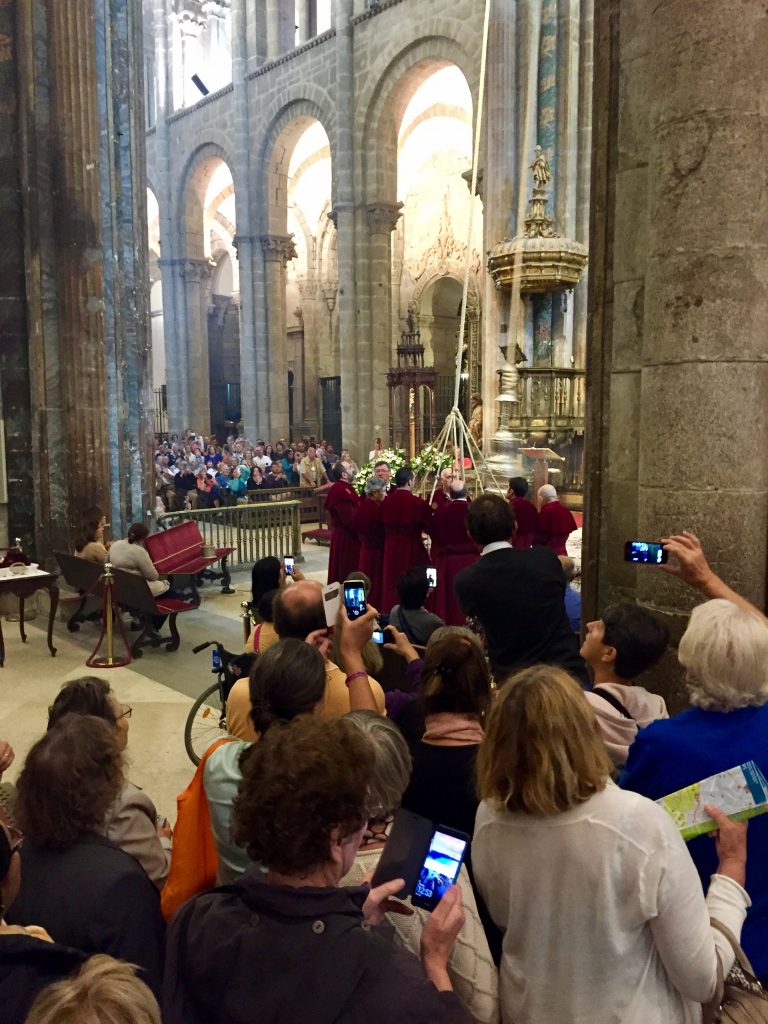 We got up at 5 AM so we could get to the Cathedral before it got busy again. That worked great! There were only a dozen or so pilgrims in the whole massive Cathedral. We climbed a narrow ornate stairway to a small area behind the statue of St James. It was lifesize and clothed in precious metals, shining in the spotlights.